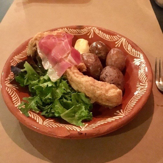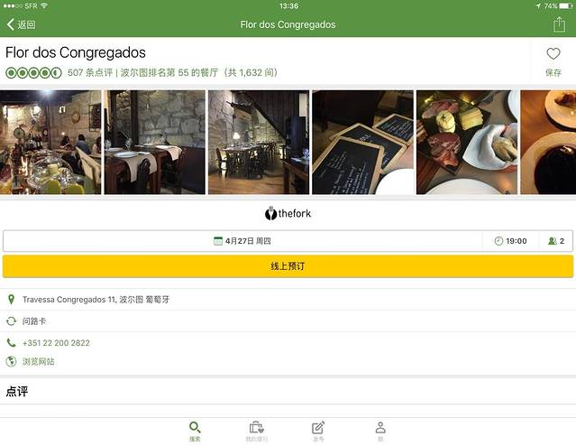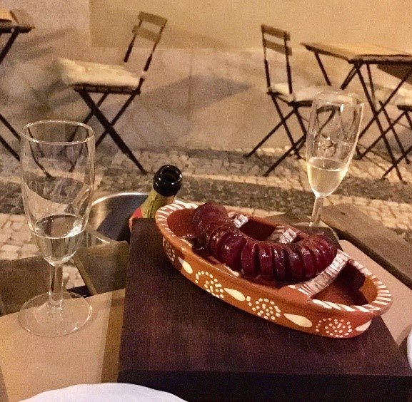 四月份日落时间挺晚大概八点半天还是亮的,晚饭在flor dos congregados 吃的,位置不好找,有一个小岔路拐进去走两步才看到。我们根据网上推荐和服务员推荐点了烤肠(chorizo), 鱼子配面包(ova) , 一个菜汤,主菜一个鳕鱼配土豆,一个七鳃鳗(Lampetra) 还有一瓶香槟。菜单上有英文,服务生也会英文点菜挺方便,价格不贵我们吃了五十多,总体来说还不错就是吃到后面主菜感觉挺腻的。