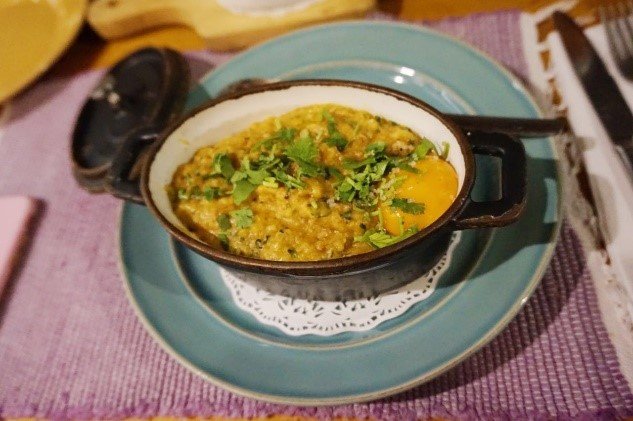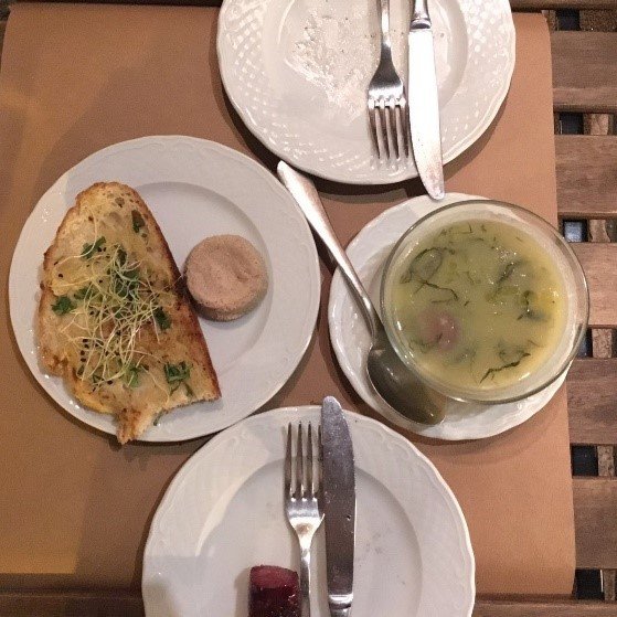 前菜我们点了一个炸的小球和香菜鳕鱼汤,小球配的是豌豆泥甜甜的,好吃!本来看攻略说的也是小球不过是四个的配的酱也不一样,我们问店家后被告知菜单改过了,不过小球还是一样的只是换了样子也换了酱,服务员还问我们是哪来的,好多游客拿着同样的图片问哦哈哈哈。鳕鱼汤一点都不腥,配上面包干和温泉蛋,好吃。主菜点了一个番茄红薯炖章鱼,一个虾粥。红薯是埋在底下的三大块整的,章鱼炖的软软的,不腥挺香的,虾粥不同于砂锅粥那种,而是比较浓的,特别鲜。另外饮料要了一个ice tea,我觉得太淡了,里头有肉桂,不喜欢的就别点了
