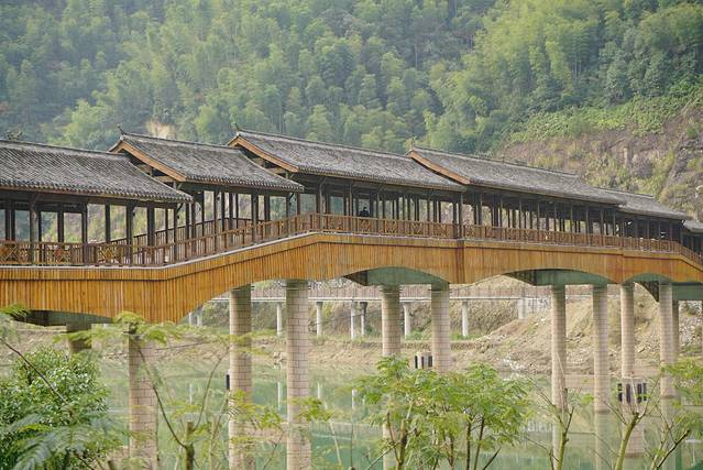 离开了畲族博物馆,我们做大巴大概七八分钟就到达了畲族廊桥。在景宁 这个地方,大概有五座廊桥,然后我们去的廊桥是当地最漂亮的一座廊桥。当地政府大概花了五六千万去打造了这样一座廊桥,全部的桥身,据官方说是用到了铁钉,然后全部用木去打造的。而且它也将畲族廊桥的特色展现的淋漓精致,看上去非常的雄伟,也是非常的独特,他的构造结构对称,非常的精美,跟旁边的山水巧妙的搭配起来,给人的感觉就是建在水上 的亭楼。
