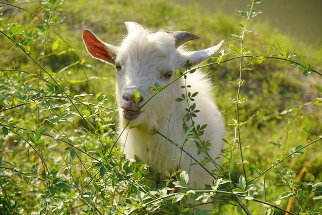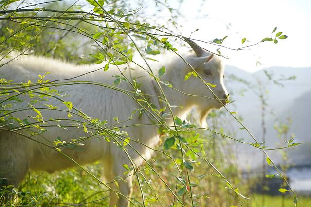桥下面的江边,我们发现了一只长着角的羊在吃草,非常的可爱。