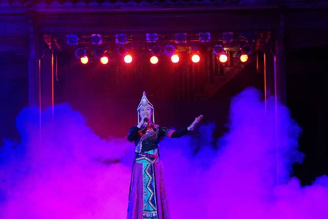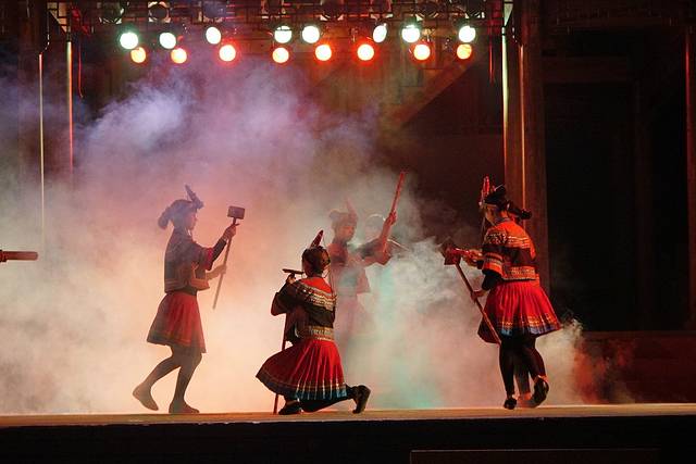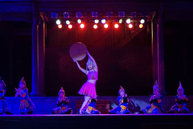 在江的另一边,类似水闸的一个地方,下面有百步钉,可以供游人走过去,从江 的一边走到另一边是一个比较不错的体验。晚上我们在印象山 哈景区,我们吃过了晚饭,大概六点左右,有一个印象山 哈民族风情舞台表演。走在路上的时候,已经看到舞台周边各种音乐灯光都在调试当中,气氛也是逐步的热起来,表演在六点半左右正式开始。