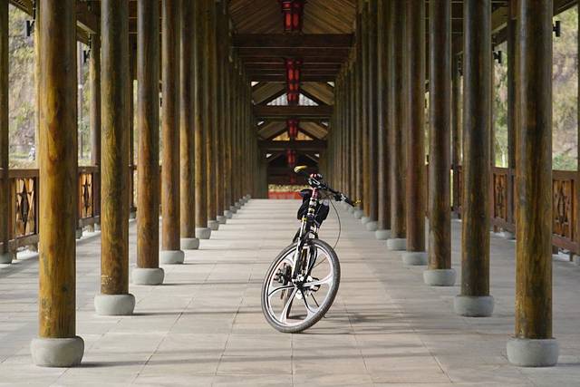 论你是自己一个人来还是跟另一半一起,还是一家三口(四口),都可以根据自己的需求来选择相对应的车型。这边除了湛蓝的湖水,茂密的绿植,金黄的枫叶,还有另一处别具一格的风景线—廊桥。这座廊桥看起来比较新,但它的整体造型,构造以及桥面的纹路,还是非常的有民族特色的。然后我们也可以骑到桥上小憩一下,边休息边看桥上的风景,迎着微风,给你无限的遐想。