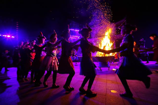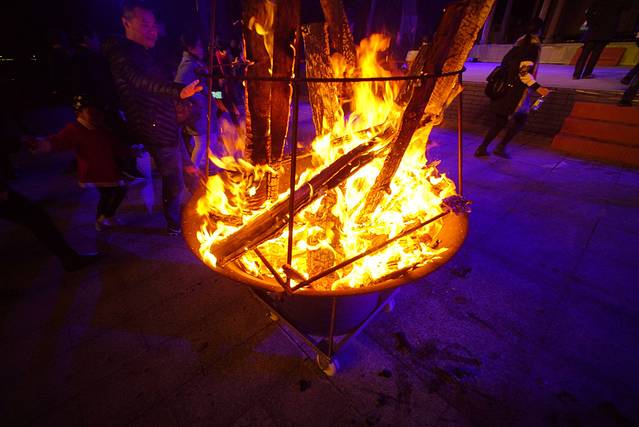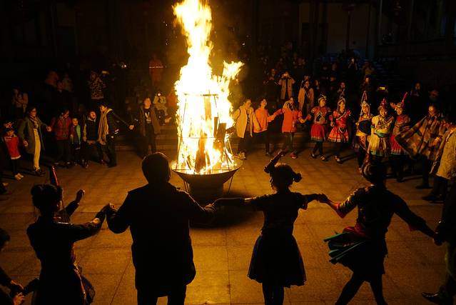 舞台表演结束,然后到台下跟观众一起围着篝火跳舞,整个过程,观众的参与感还是很活跃的,围着火炉非常的温暖,然后大家一起跳竹排舞。