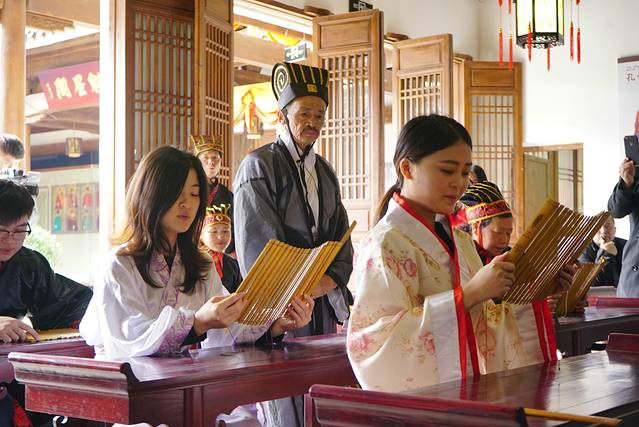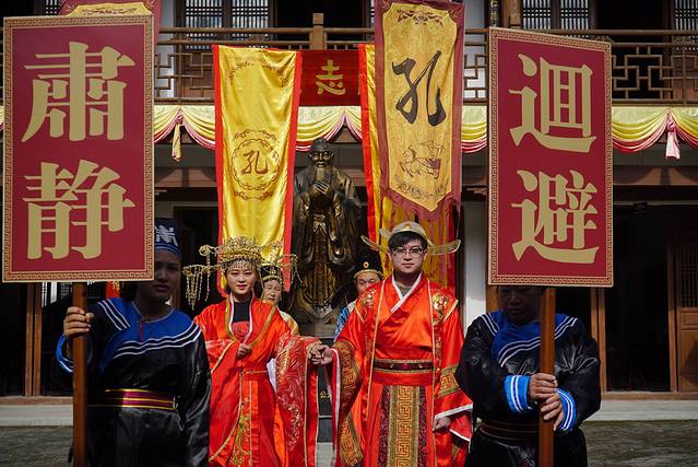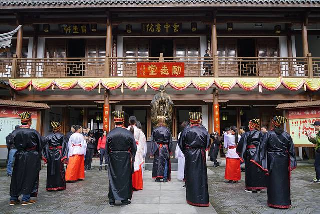 其间,我们看到有一部分人换上了当时学生们穿的服装,去体验了一下以前他们上课的内容及形式,再现古代私塾授课的场景。再进到励志堂之前,他们会一起祭拜孔子,然后再进到教室每人再找到自己的位置坐下。从这里可以看出那时候人们对老师的尊重尊敬,古代老师的地址也是很崇高的。