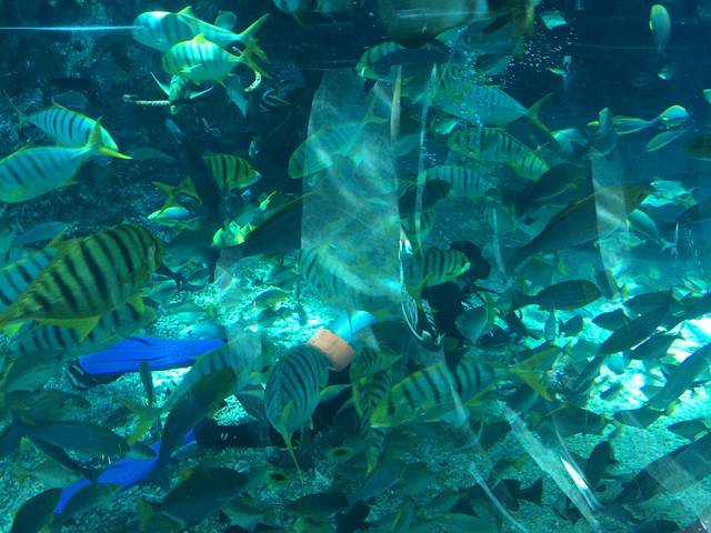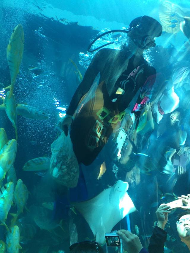 刚好我们还遇到了“与人共舞“的表演,其实就是工作人员穿好潜水服到里面,在一堆鱼的包围下喂食。