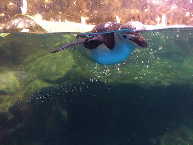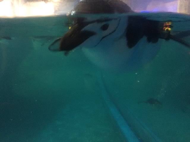 在企鹅馆我们拍了一张企鹅宝宝的特写。当时这张企鹅特别可爱,一个劲的往玻璃这边游,明明游不出来还不停的扑腾翅膀。整个肚子鼓鼓的浮在水面上,笑死我了。