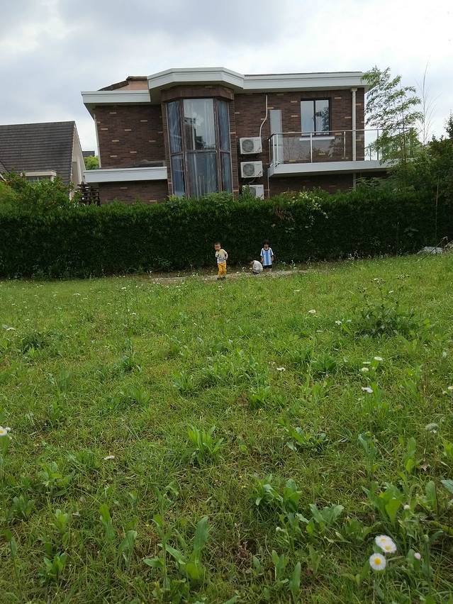 别墅外面的草坪,小朋友们在玩沙子