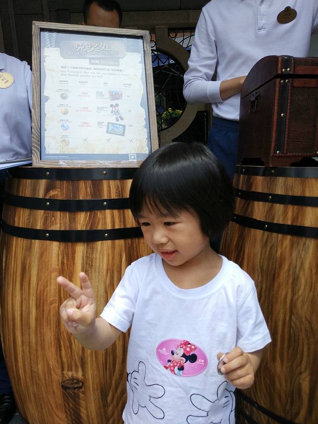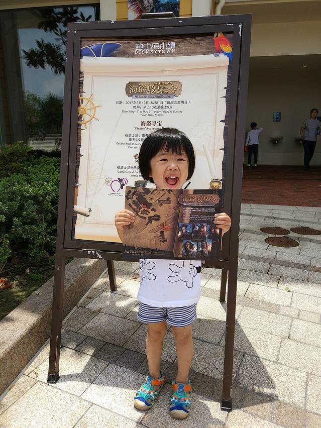 今天下午三点多的高铁返程,所以上午还有点时间,忍不住又来了一趟迪士尼,第一天太赶了,只注意去玩了项目,迪士尼的情结完全没有被满足,我理解的迪士尼是欢乐,梦幻,惊喜和悠闲,所以我们今天的目标是迪士尼小镇,购物和休闲。到了迪士尼已经上午10点左右了,很多已经进去了,当然依然有很多人在排队,似乎排队才是迪士尼永恒的主题。我们先去了迪士尼商店,买了一点小纪念品,然后出门逛了逛,正好看到有乐队在表演,很嗨的,还有拿着空气球的工作人员在边上好多人拍照,气氛很欢乐,这才是我要的迪士尼的感觉。走了一段突然看到一个神秘的小木桶和一个工作人员,我们问了一下这是什么,工作人员说这是小镇推出的寻宝活动,只要那一张寻宝图,找到小镇里面四个藏起来的工作人员并且盖章就可以完成任务,任务完成以后就可以抽奖,瞬间激动了\(≧▽≦)/,这就是我要的迪士尼的感觉,梦幻和惊喜!开心极了,马上去领了一张宝藏地图,杨梅也特别开心,自己屁颠屁颠的找着藏起来的工作人员,平时非常抗拒陌生人的杨梅,居然主动找到盖章的工作人员要求盖章,还特别配合的合影照相,可见到底有多嗨了。完成任务后,就到了抽奖环节了,我本来是不报任何希望的,毕竟我们一直以来运气都很一般,结果没想到杨梅还抽到了一个三等奖,真是幸运!玩了一趟,时间差不多了最后我们看到空旷的广场决定留念一番,于是叫工作人员给我们拍了一个背影大合照,是不是很有感觉,亲子装真的很吸睛,建议大家带孩子去迪士尼也可以试试。本来中午打算吃一下迪士尼小镇评价最高的蓝蛙,可惜我们去的时候排队居然要30分钟,实在是没有耐心了,随便去了一个吃饭的店子,吃的经典热狗就是面包夹香肠淋了点番茄酱,48元!还好杨梅吃得非常开心!