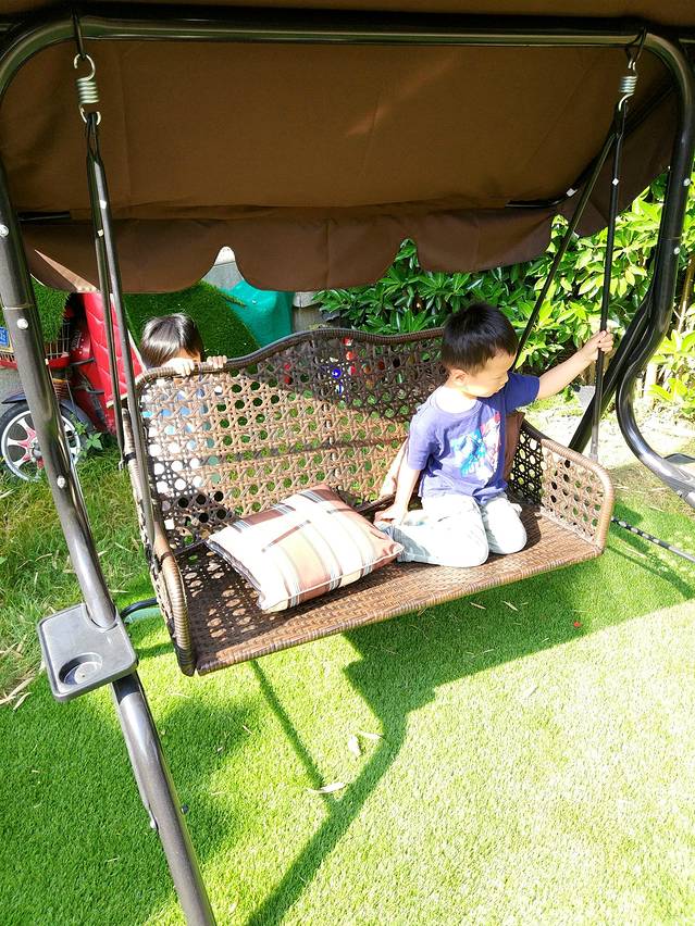 清晨,阳光,秋千,杨梅和浩浩