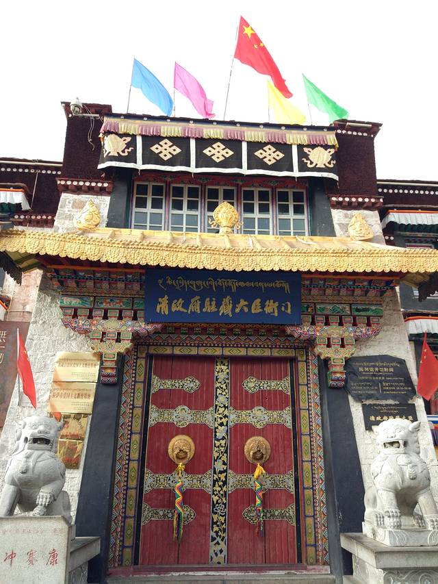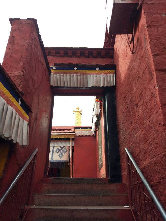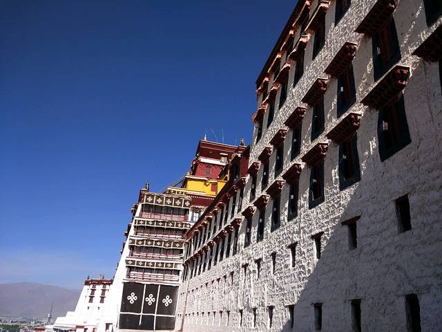 丹杰林寺,拉萨寺庙砖墙鲜艳的色彩,红黄白。