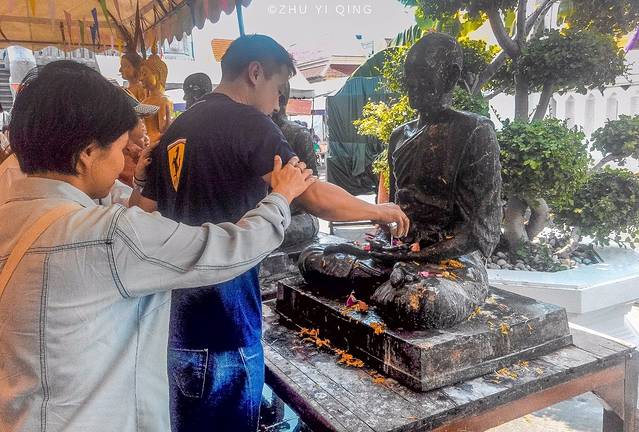 曼谷的寺庙随处可见,时不时就会来个偶遇,前往唐人街的路上,就发现了一座大寺庙。门口人头攒动,都在给佛像洒水。泼水狂欢,不是每个人都能像小年轻那么精力旺盛地去狂欢,就像中国过年上庙里烧香一样,大部分的泰国人在新年期间到寺庙里给佛像和僧侣洒水沐浴,祈求来年平安。
