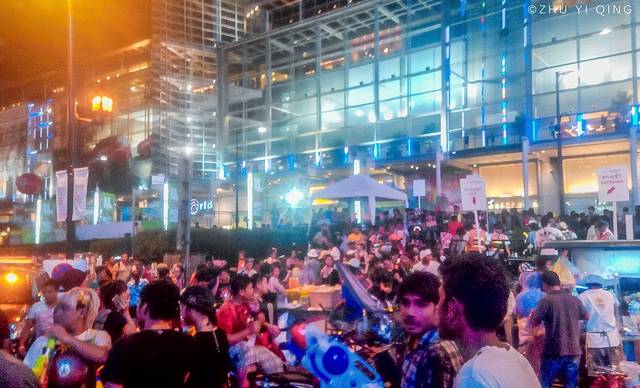 暹罗广场和BigC中间是曼谷市中心狂欢的圣地,基本上这条马路是挤得水泄不通,广场和BigC两边各有个舞台,舞台上是热舞劲歌,两边的帷幕上装着水管,不断喷洒着,越是接近零点,人潮的狂欢气氛就喷至顶点。