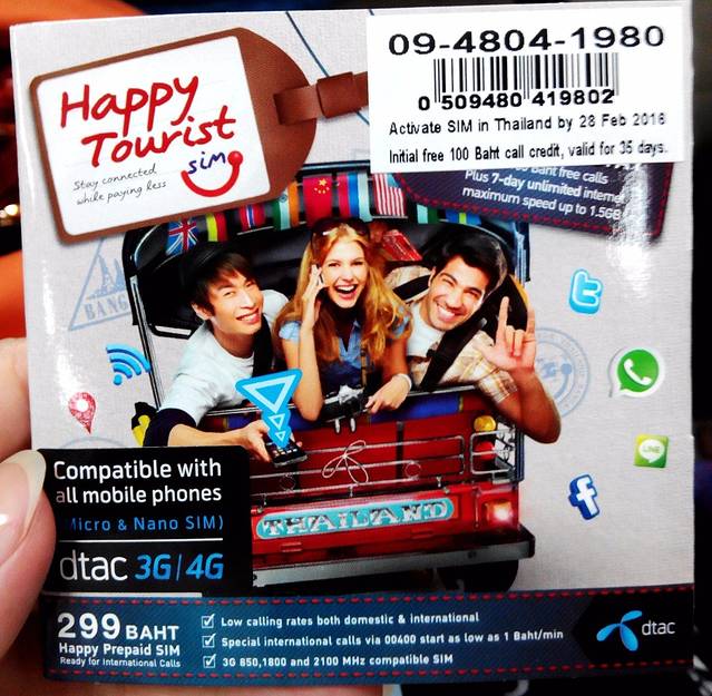 至于手机卡,泰国一般用两种卡,Happy Tourist或Truemove,我用的是299猪的Happy卡,7天无限流量+100猪话费,虽说无限但也是1.5G流量, 7天内根本用不完,除非没事看个电影下个电视剧。插入手机后,发个短信设置一下网络就可以用了,悲催的我卡放进去还是无服务只能到dtac营业厅解决。