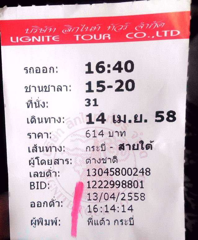 我竟然也是跑到三公里开外的另一个bus terminal亲自买票,当中遭遇一点曲折,变成了一个泰国叔叔开摩托车载我去……车票614铢,下午四点半发车,凌晨到某个小镇休息放饭……