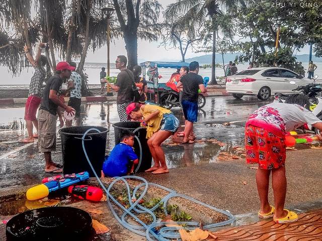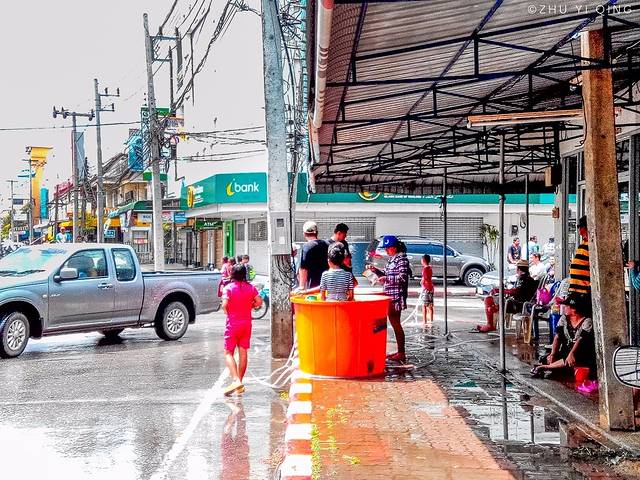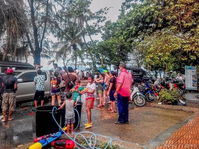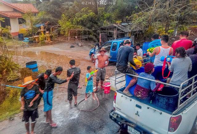 从甲米回泰国的路上,经过很多小村庄,再小的地方,新年气氛也少不了,家家户户直接把水桶抬到路边,逢车辆经过,就操起管子得劲地喷,玩泼水玩脱了。看着他们脸上的笑容,啊~竟然有股治愈的感觉,明明是我被喷了啊!