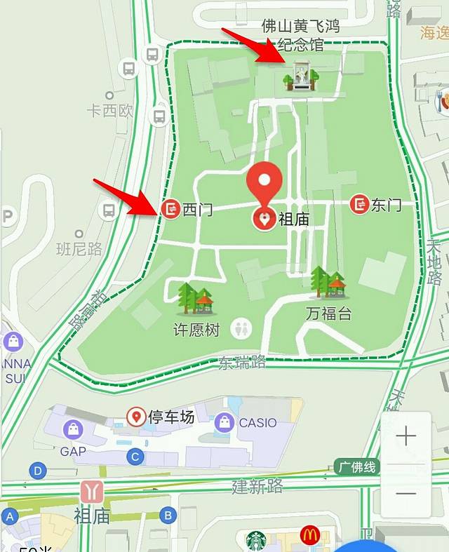 售票处在西门,从西门进,从黄飞鸿纪念馆的门出去就是手信街。