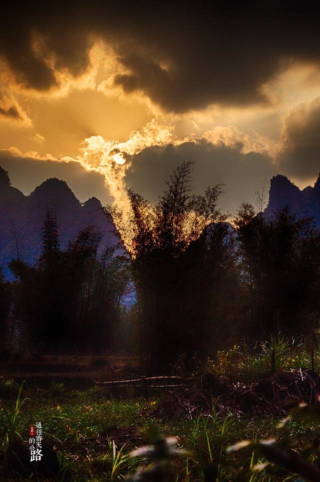 青山叠叠,竹影婆娑,太阳就要在云中坠落山间。