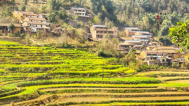 层层叠叠的梯田犹如阶梯般直通依山而建的村落。