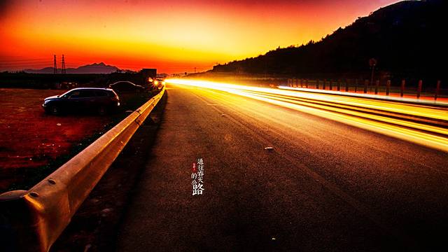 夜幕即将降临,飞驰而过的车灯划出美妙的线条。