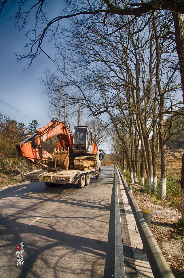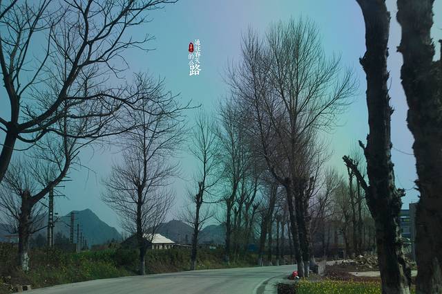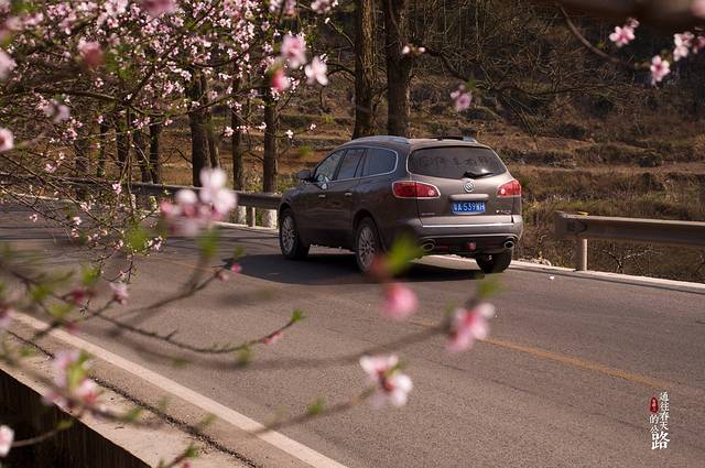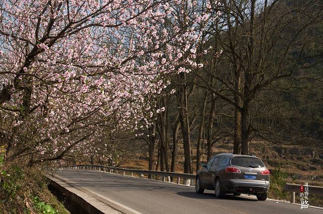 路边一排桃树,车子驶过,仿似误入了桃花谷。