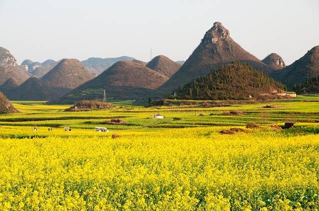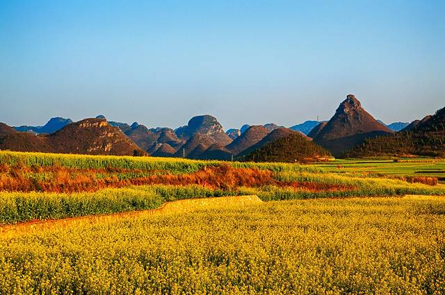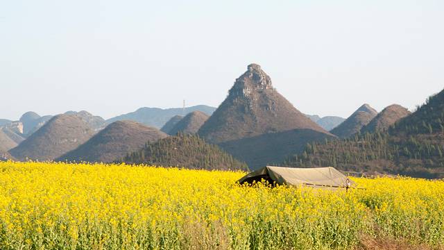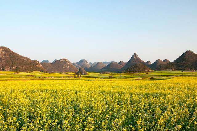 金鸡峰丛是罗平峰林的核心景观,喀斯特地貌在很多人印象中是贫瘠的,但在罗平,你见到的是另一番景象。窝窝头般的小山包散落在罗平坝子之中。山峰之间的大片平地布满了连绵的油菜花田,就像一片金色的海洋。