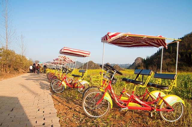 游客可以租这些多人单车,在油菜花田和峰丛间自由穿行。