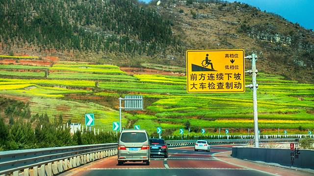 从广西穿越到云南,一路逐渐上坡,穿过一个个隧道之后,顿感画风特变。进入云贵高原之后,路两旁低矮的峰林变成了连绵的大山,高速公路就在山上飞弛而过,很多路段都严格限速80。山上的石灰岩也变成了红土地,竹林也变成了桉树。