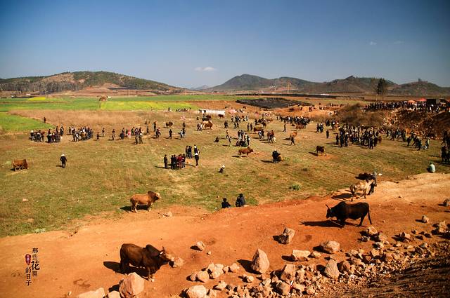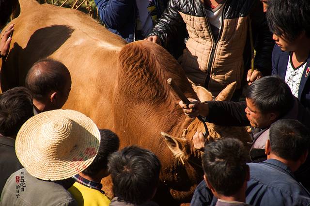只见好多强壮的牛就在空地上独自呆站着,时不时发出低沉的嚎叫声。人们一群群地围观着正在被用镰刀割角的牛。