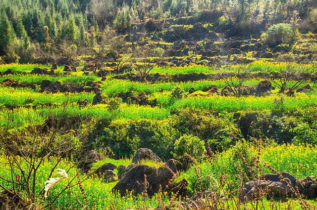 石林中的油菜花,很有层次感,就像空中花园一样。