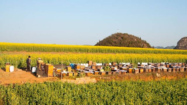 罗平有80万亩油菜花,加上花期较长,初春之前已经有很多养蜂人家在此安营扎寨。待到夏天,油菜花逐渐凋零,这些养蜂人才会到别的地方继续追逐花香的旅程。