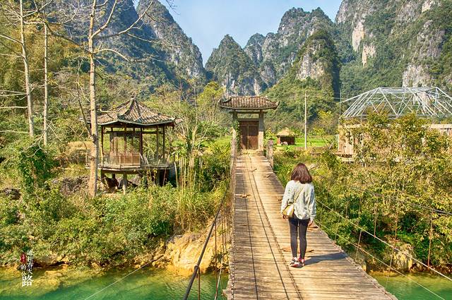 明仕河发源于越南,在我们刚经过的雷平镇和黑水河汇合。明仕山水田园风光集中在明仕至拔浪一带。我们没有像普通游客那样乘竹筏顺流而下。开车经过也会看到峰林景观,看到凤尾潇潇,龙吟嘀嘀的碧江竹影。