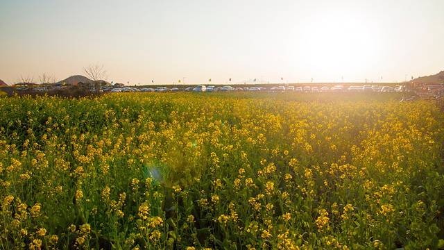 阳光把油菜花照耀出高饱和度的金黄色调,人们在油菜花海中自在畅游。