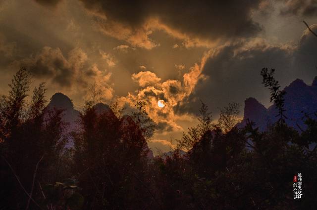 日落的余晖尚远山之上,月亮已经悄悄地爬到头顶。