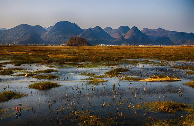 普者黑湖为高原淡水湖,也叫灯笼湖,当地人民还有称之为珍珠湖的。湖面不算辽阔,更像是蜿蜒的河流。这个季节已经没有荷花可赏。只剩下些枯黄的茎和莲藕了。倒有几分”枯荷残蓼满秋池:的味道。相信夏季万亩荷花盛开的时候必然美到入心。我更喜欢那种“接天莲叶无穷碧,映日荷花别样红”的感觉。