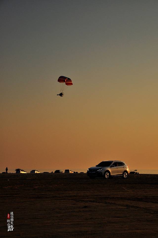 动力来自车子后面的大风扇般的螺旋桨,一阵加速助跑后,降落伞迎风升起,带着车子飞了起来。