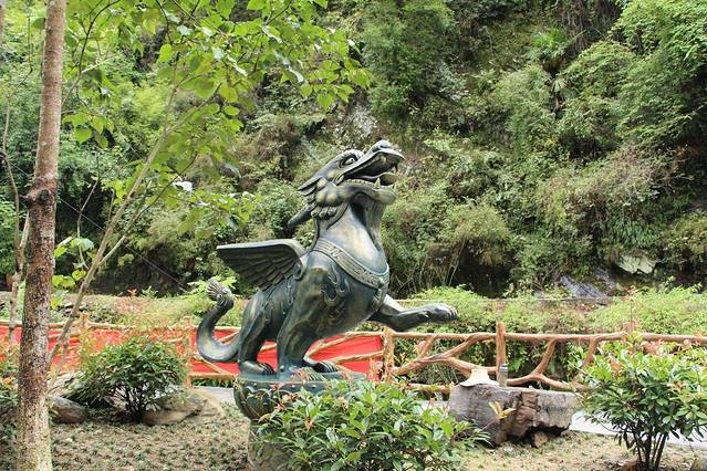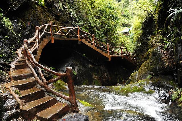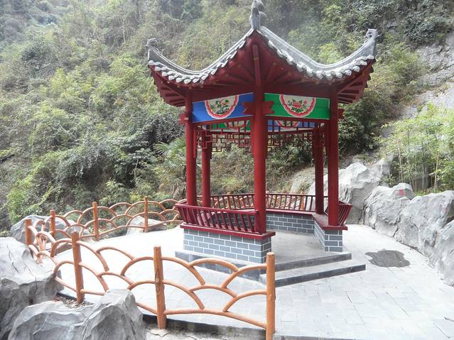 峡谷过后开始登山,我们选择的这条线路上山较陡,一路走走停停,但沿途风光无限,临绝壁险境、陡峭如削的揽景亭,心情很是豪迈。走过观景亭后,在一片竹林掩映中,走入山顶青龙寨的大门。寨子里有青龙堂和青龙庙,我们在这里稍作歇息,准备进入前面不远处的玉龙宫。