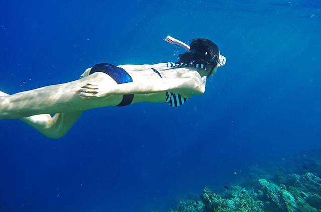 今天参加预定的浮潜课程,大约两小时。潜导会在船上先教一下面镜呼吸管的用法,怎么样保持面镜乾躁,如何呼吸吐水等基本知识。下水后,潜导会带一根浮绑,初次浮潜的朋友除了穿救生衣还可以拉着浮棒。我是会游泳的,趁此机会找潜导学一点自由潜的技能。