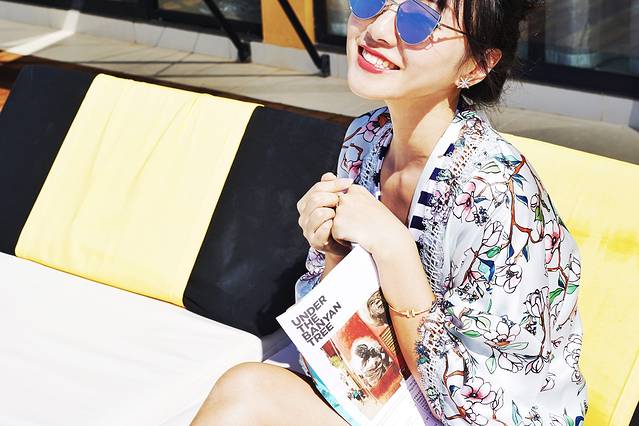 因为我们这班水飞太满了,我的大件行李被安排在下一班水飞,洗了澡不能换衣服是多忧伤的事,你们能体会吗?不过如此良辰美景,我还是立马开启了放电模式。换个心情不就是把领口拉到一边,把衣角打个结这么简单。