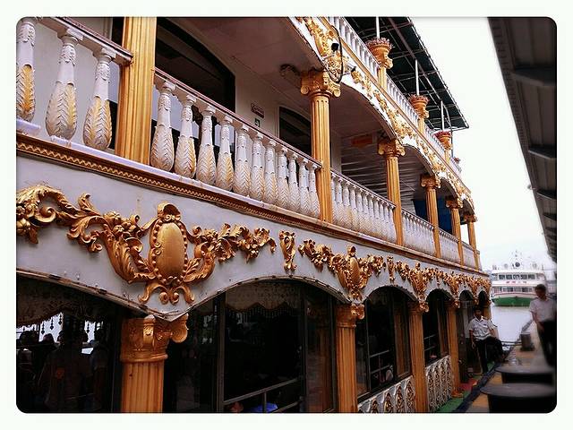 我们买的50元往返,据说是豪华版,轮船还不错,金黄色有专门的包间15元/人,不过真心建议大家早点上船,可以抢到窗边位置也可以观看哦!一路还有讲解和钢琴演奏,很不错呢!😏