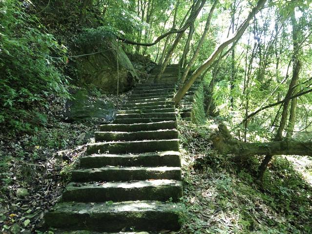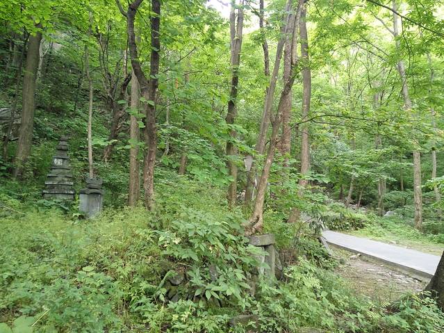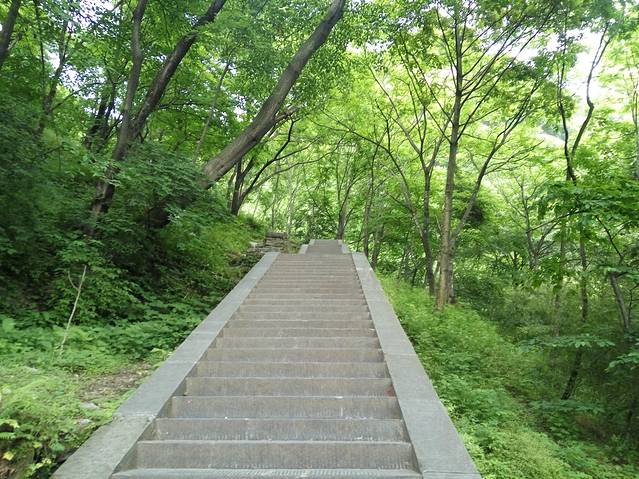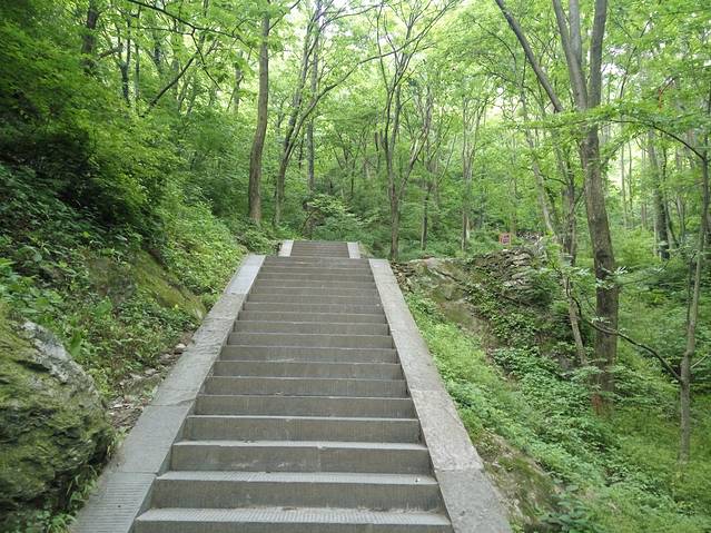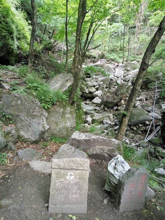 过了河,走途中系红带子的这条路。沿着五龙峡,经过天池,到南岩宫。这条路好走,全程石头或水泥铺装的路面或者台阶。