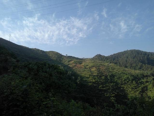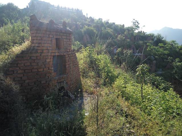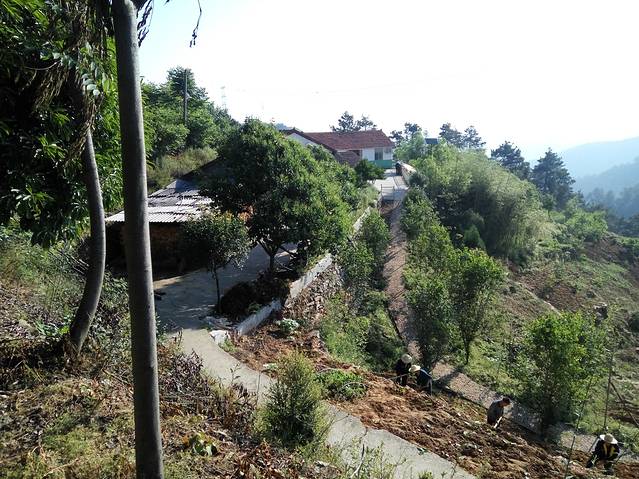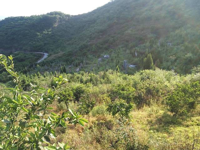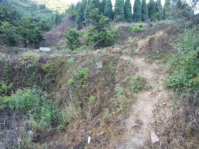 经过这个山坡的时候有一片坟地,坟地再往前走几步有一条小土路。沿着小土路翻过这个山坡可以近一点。参照物就看上面的电线杆和小树好了。怕麻烦也可以走公路。