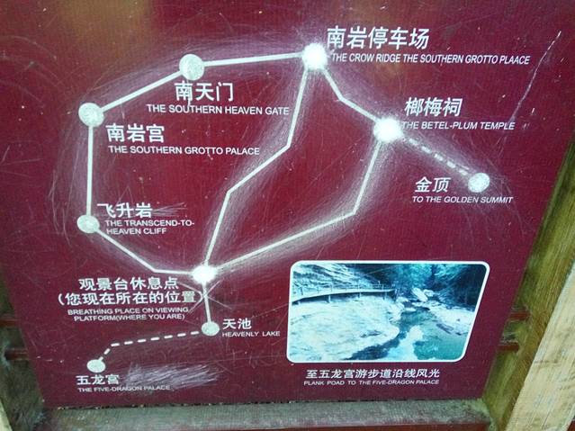一日游①:游客中心摆渡车--太子坡--琼台,琼台索道站--金顶索道站--太和宫,金殿--原路返回到太子坡,时间充裕就去紫霄宫和南岩宫,然后下山。