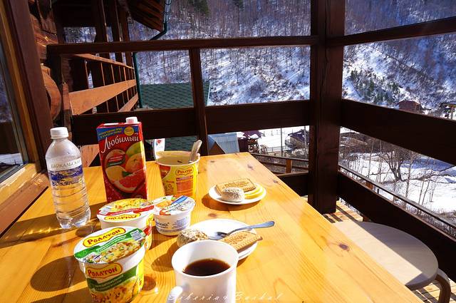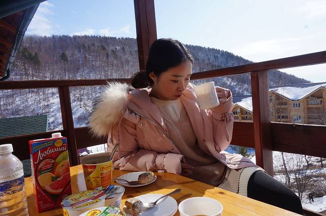 3、在利斯特维扬卡也是在网上订的利斯特维扬卡小木屋旅馆,一晚2600卢布,只能付现金。酒店位于半山腰,位置比较偏僻。酒店大厅全天免费提供茶水点心,房费含一顿丰盛的早餐。如果需要在酒店吃晚餐,提前预定就行,550卢布一人。女主人会讲英语,很热情,办理好check in,女主人会给我们介绍一下周边的景点,得知我们要去滑雪场,还帮我们订车。有免费的WiFi
