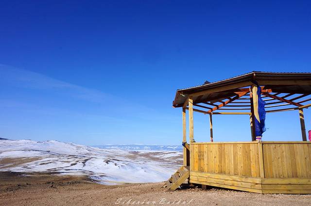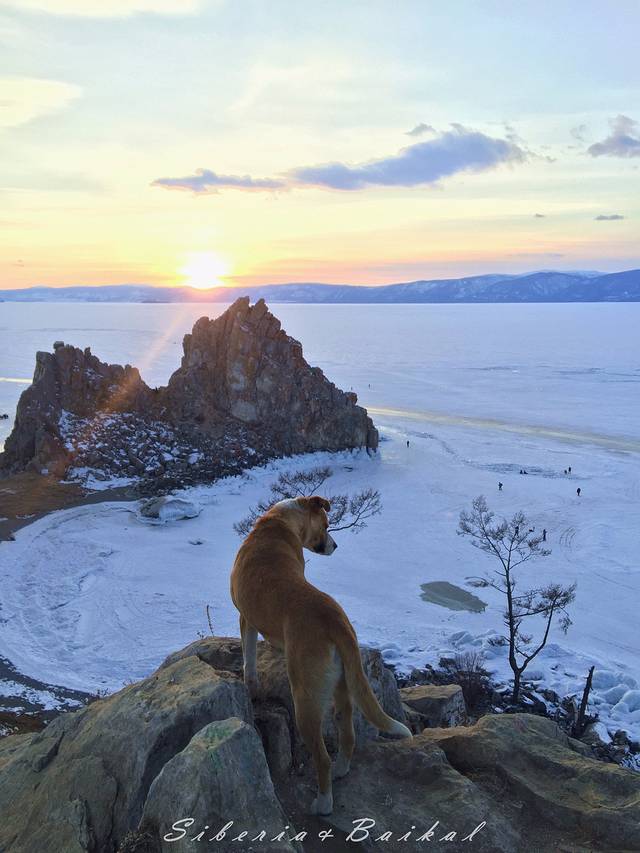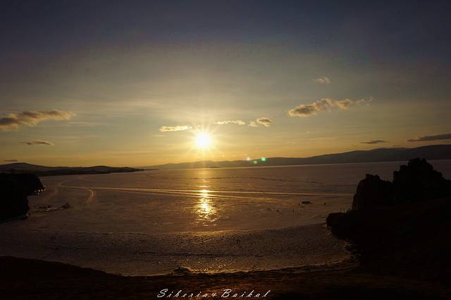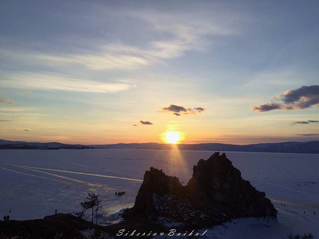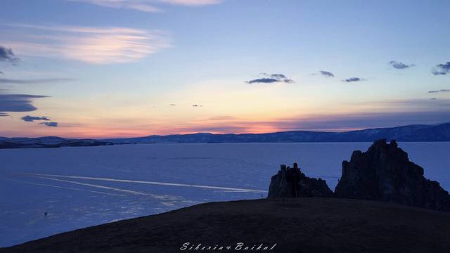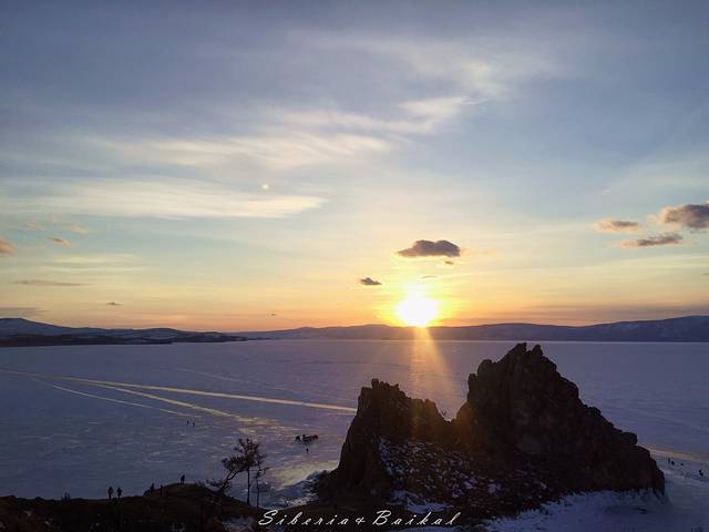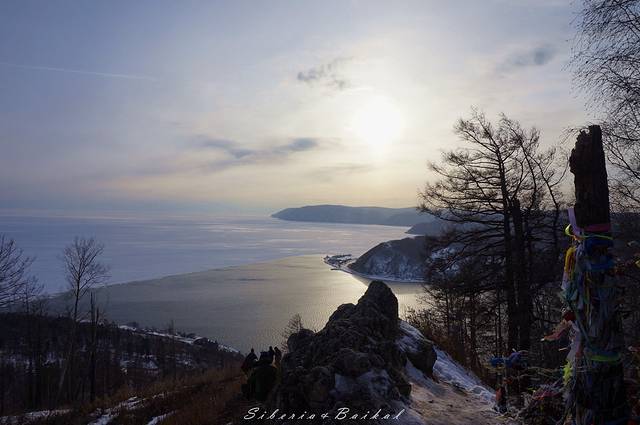 利镇的观景台,我们去的时候下面已经有好多摄影爱好者在等日落。远处是安加拉河与贝加尔湖的交汇处,由于安加拉河常年不结冰,因此就有了这样一边是冰封的湖面一边是潺潺流水的景色