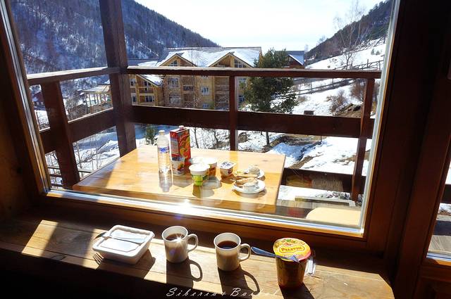 到了旅馆,前台是一位上了年纪的阿姨,特别友善,这家店只能付现金,不能刷卡。办理好入住,她带我们在大厅转了一圈,告知我们摆在桌上的糕点、茶水都是免费,并且给我们画了地图,告知我们滑雪场等地的路线,另外如果需要叫出租车,她也能帮忙叫的。