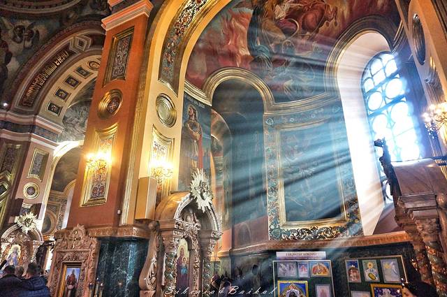 庞大的喀山大教堂坐落在俄罗斯的伊尔库茨克市区,是伊尔库茨克最大的一座东正教教堂,也是伊尔库茨克市内70几座教堂中最精美的一座。从外观看,橙红的墙壁,蓝色的窗框与房顶,色彩鲜艳,像极了童话故事中的主题公园。走进教堂内,更是像宫殿一样金壁辉煌又不失神圣与庄严。教堂内的壁上画了很多圣人,每一个俄罗斯人都在虔诚的做祷告。
