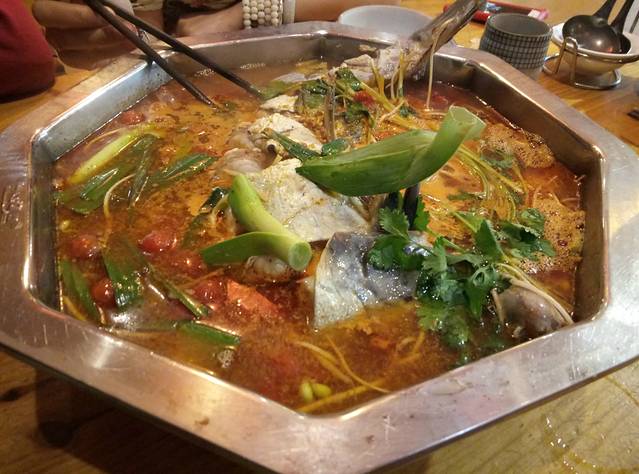 吃:到了贵阳北站已经是下午2点半了,走到对面的神州租车拿到车已经3点多一些,但是小伙伴们还是抵挡不住美食的诱惑先驱车前往市区的“老凯里酸汤鱼”去美餐了一番。我们去的是位于北京西路的“老凯俚酸汤鱼(银海元隆店)”。