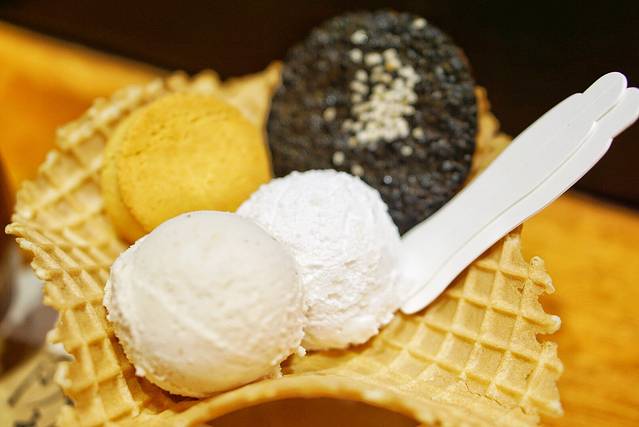 冰淇淋的口味很独特,我们要了醪糟味和核桃味的球各一个。