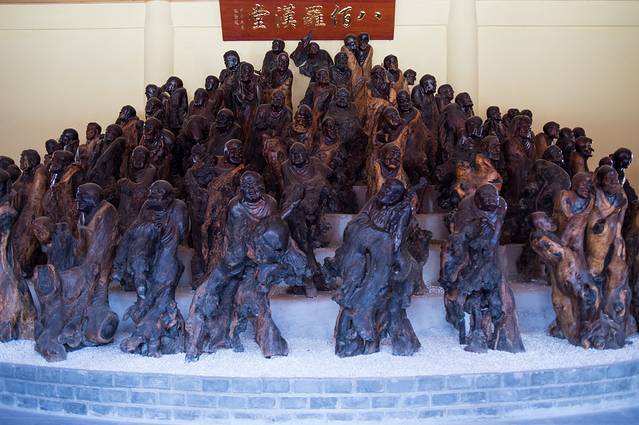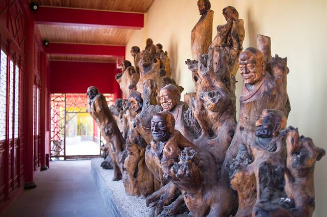 而后院的根雕佛国更让我大吃一惊,其气势雄伟程度绝对不亚于任何一座寺庙,四大天王、八百罗汉,其造型生动、栩栩如生,堪称鬼斧神工,如此精美的根雕实属罕见。