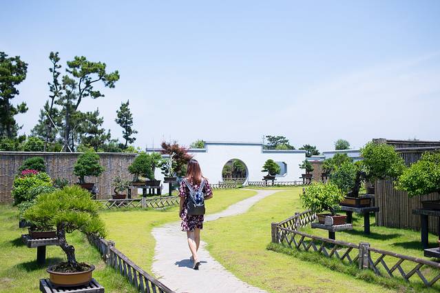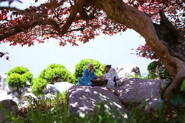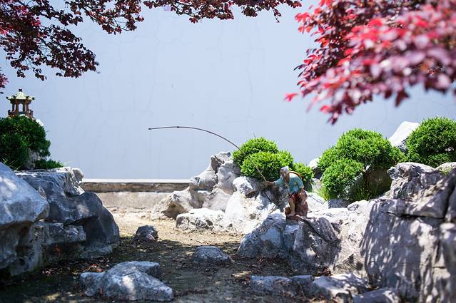 景区内还有高端盆景区,里面有镇园之宝——连理迎客松和四大组合盆景,以及其他大小近千盆各具特色的桩式盆景。细心会发现,植株内也暗藏一片天地,有垂钓以及对弈的老者。